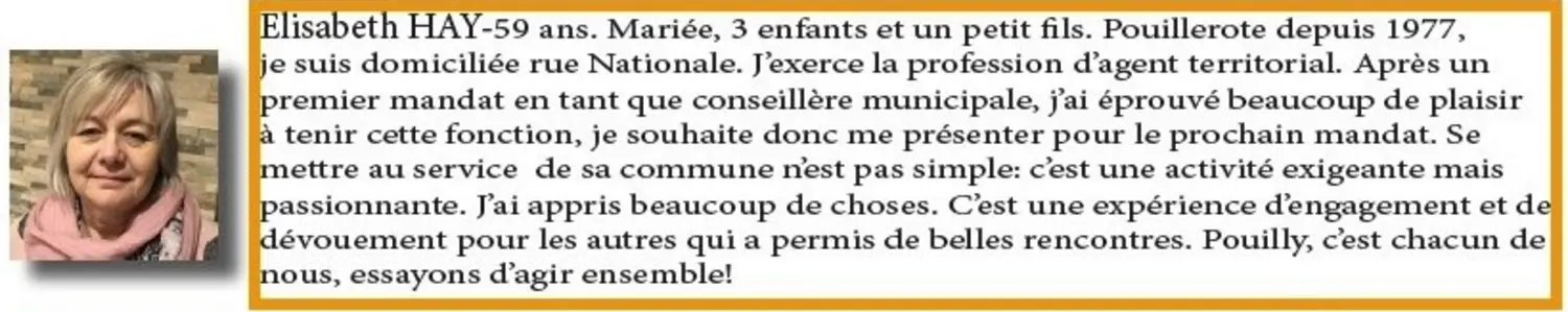 Le Conseil municipal de Pouilly est constitué légalement de 15 membres élus au suffrage universel direct pour 6 ans. Il règle par ses délibérations les affaires générales de la commune (budget communal, programmation des travaux à entreprendre, attribution de subvention etc…).